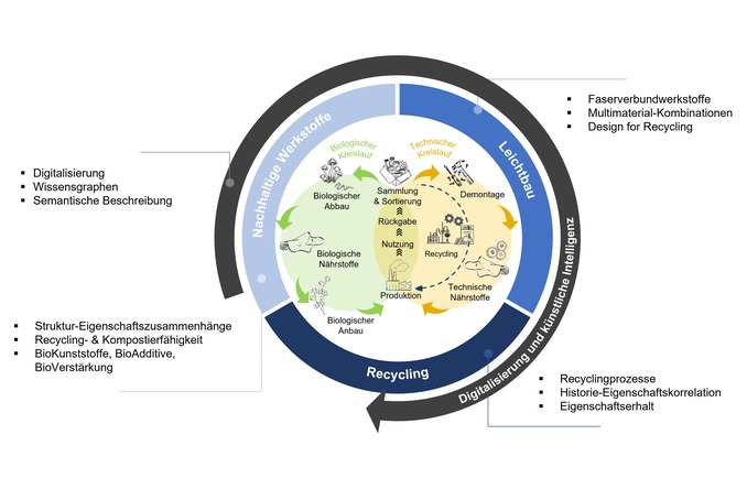 Daraus leiten sich drei Forschungsschwerpunkte: Nachhaltige Werkstoffe, Leichtbau und Recycling ab. Stets werden die Ergebnisse auf eine Art und Weise dokumentiert, die eine nachträgliche KI-gestützte Material- und Prozessauswahl ermöglicht.