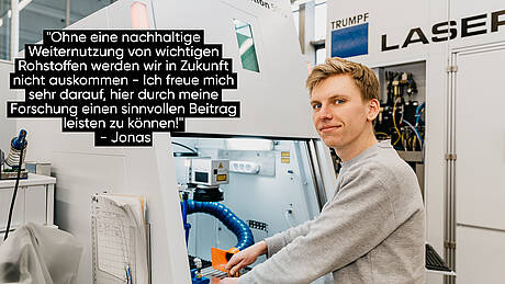 In meiner Forschung untersuche ich, wie man das Material abtragen kann aber es geht auch um die werkstofftechnische Betrachtung, ob und wie gut das Material dann noch für die Weiternutzung in neuen Batterien geeignet ist – diesen Teil bearbeite ich am IMFAA. Ohne eine nachhaltige Weiternutzung von wichtigen Rohstoffen werden wir in Zukunft nicht auskommen - Ich freue mich sehr darauf, hier durch meine Forschung einen sinnvollen Beitrag leisten zu können!