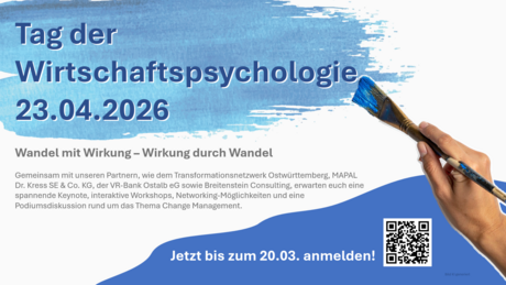 Am 23. April 2026 lädt der Studiengang Wirtschaftspsychologie der Hochschule Aalen in Kooperation mit dem Transformationsnetzwerk Ostwürttemberg zu einem Nachmittag des fachlichen Austauschs und der Vernetzung ein. Von 12:30 bis 17:30 Uhr treffen sich Wissenschaftler:innen, Unternehmensvertreter:innen und Studierende, um aktuelle Themen der Wirtschaftspsychologie zu diskutieren und Impulse aus Forschung und Praxis zusammenzuführen.