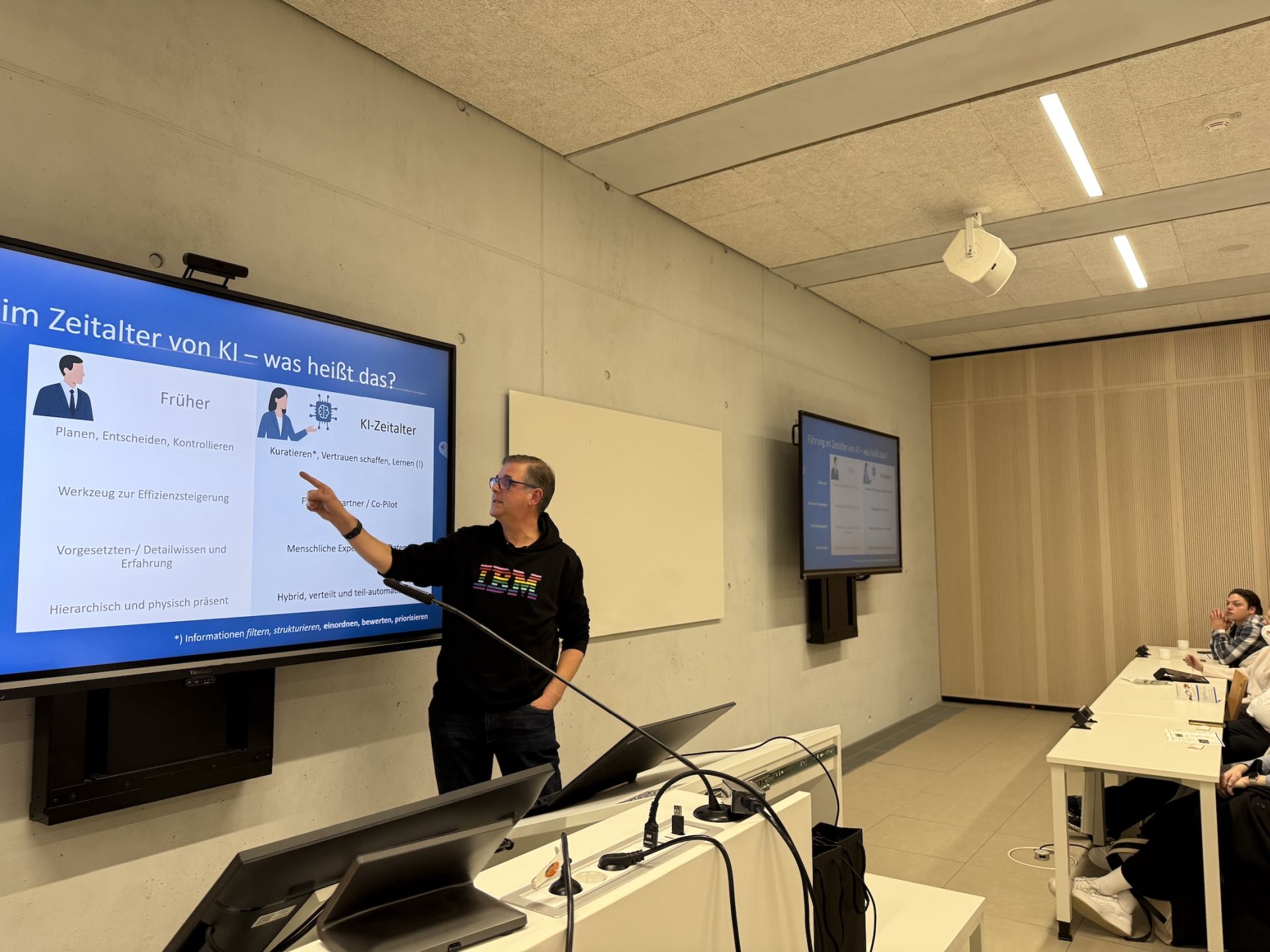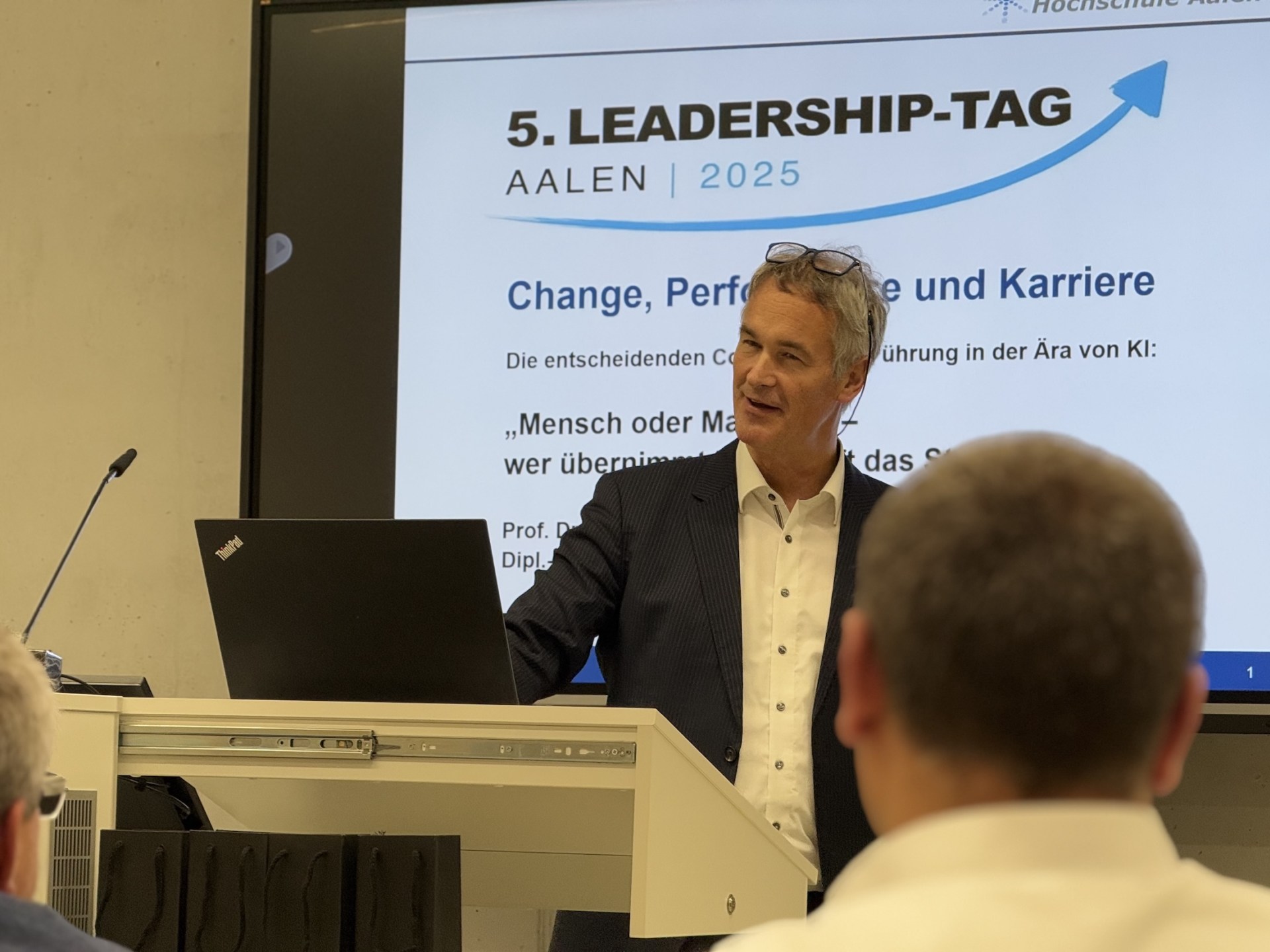Mi, 07. Januar 2026 → Der 5. Leadership-Tag Aalen am 12. November 2025 war mit Teilnehmerrekord und sehr positivem Feedback ein voller Erfolg. Im neuen WIN-Gebäude der Hochschule Aalen standen unter dem Motto „Change, Performance und Karriere – Core Skills für Führung in der Ära von KI“ Keynotes von ODR/ENBW, IBM und der Hochschule sowie ein interaktiver KI-Theater-Workshop im Fokus. Organisiert und moderiert von den Masterandinnen des Studienganges Leadership in Industrial Sales & Technology Christin Göpfert und Sinem Demirtas endete die Veranstaltung mit einem Get-together und großer Vorfreude auf den nächsten Leadership-Tag.