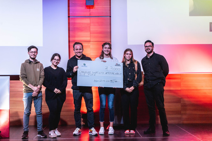 Das Team „Die Füxe“ aus dem Studiengang User Experience der Hochschule Aalen gewinnt die Challenge „Future Mobility“ der Städte Aalen und Heidenheim. V.l.n.r.: Peter Munz, Cassandra Demir, Felix Unseld (Wirtschaftsförderer der Stadt Aalen und Challengeber), Clara Sorg, Sina Engmann und Matthias Bleil. Foto: © Hochschule Aalen | Christian Baron