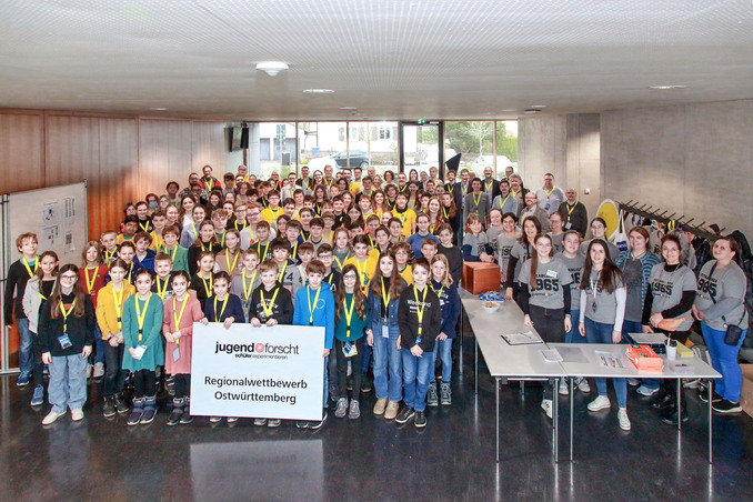 Unter dem Motto „Mach dir einen Kopf!“ haben am 23. und 24. Februar 94 Jungforschende beim Regionalwettbewerb Ostwürttemberg von Jugend forscht ihr Können unter Beweis gestellt. Hunderte Gäste zog es am Samstag zum Tag der Öffentlichkeit und der Wettbewerbsfeier in die Hochschule Aalen. Nachdem die Projekte bereits am Freitag begeistert einer Jury aus Industrie, Schulen und Uni/Hochschule vorgestellt wurden, warteten die Teilnehmenden am Samstag gespannt auf ihre Platzierung. Die Wettbewerbsleiterin Sonja Fick und Professorin Frau Dr. Anja Dieckmann moderierten die Feier, bei der auch Landrat Joachim Bläse, CDU-Abgeordneter Winfried Mack, Jugend forscht Abgeordnete Susanne Schäfer und Prof. Dr. Harald Riegel, Rektor der Hochschule Aalen, die Projekte bestaunten.