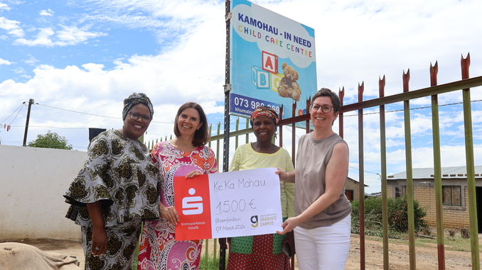 Birgit Welt (2.v.l.) und Dr. Alexandra Jürgens (rechts) vom Graduate Campus bei der Spendenübergabe im südafrikanischen Bloemfontein. Foto: privat