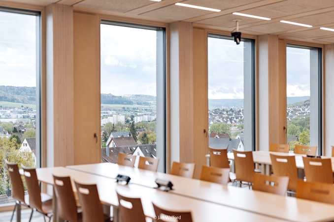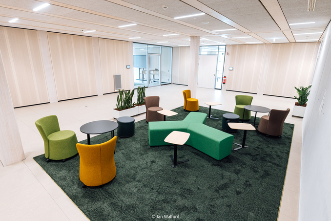 Der hybride Holzbau mit seinen hellen und modernen Räumlichkeiten bietet auf rund 3.500 Quadratmetern Platz für 800 Mitarbeitende und Studierende. Foto: © Hochschule Aalen | Jan Walford 7. Foto Sitzecke: Gemütliche Sitzecken bieten viele Möglichkeiten zum Lernen, Austauschen und Begegnen. Foto: © Hochschule Aalen | Jan Walford