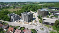 Das neue WIN-Gebäude (Mitte) der Hochschule Aalen: Baubeginn war Ende 2020, gestern wurde das neue Fakultätsgebäude für die Wirtschaftswissenschaften, in dem auch das International Center seine neue Heimat hat, feierlich vom Finanzministerium an die Hochschule Aalen übergeben. Foto: © Hochschule Aalen | Benjamin Engel