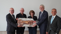 Schlüsselübergabe: Prof. Dr. Harald Riegel, Ministerialdirektor Dr. Hans J. Reiter, Finanzstaatssekretärin Gisela Splett, Andreas Hölting (Direktor Landesbetrieb Vermögen und Bau Baden-Württemberg) sowie Dr. Stefan Horrer (Leiter Vermögen und Bau Schwäbisch Gmünd, v. l.n.r.) freuen sich über die Eröffnung des neuen WIN-Gebäudes. Foto: © Hochschule Aalen | Saskia Stüven-Kazi