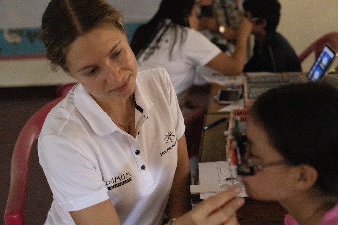 Die Untersuchungen der Augenoptik-Studentinnen Emma Kiss, Marina Kimmich und Lina Puscher erfolgten in drei Schritten: Als erstes wurde die Funktionalität der Augen überprüft und eine kurze Sichtkontrolle durchgeführt. Medizinisch auffällige Augen wurden an eine örtliche Augenklinik überwiesen. Im Anschluss folgte eine Messung mit einem Autorefraktometer, mit dem grobe Fehlsichtigkeiten ermittelt werden. Es folgte die Ermittlung der Sehleistung. Bei allen auffälligen Kindern wurde eine ausführliche Augenglasbestimmung durchgeführt. Bei allen Untersuchungen unterstützte dieses Mal Bishal Hamal, Optometrist aus Nepal und nun Masterstudent im Studiengang „Vision Science and Business“ an der Hochschule Aalen, der die Sprachbarriere überbrücken konnte.