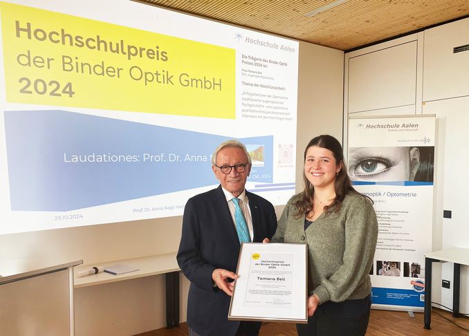 Zu wenig eingeplante Zeit, emotionale Faktoren, mangelnde Organisation, fehlende Kommunikation, überhöhte Kaufpreisvorstellung und vieles mehr – es sind viele Aspekte, die ein Scheitern bei der Übergabe traditioneller augenoptischer Fachgeschäfte begünstigen. Vor allem kleinere Betriebe verlieren im Prozess häufig die Hoffnung auf eine Übergabe, weshalb mehr als die Hälfte der Inhaberinnen und Inhaber an eine Schließung denkt. Diese Betriebe sind für die Versorgung in der Region jedoch elementar. Wie eine erfolgreiche Übernahme gelingen kann, damit beschäftigte sich Tamara Beil in ihrer Bachelorarbeit. Hierfür führte die Augenoptik/Optometrie-Studentin zahlreiche Interviews mit den Nachfolgerinnen und Nachfolgern. Für ihre umfangreiche Recherche und die qualitativ hohe Evaluation der Interviews wurde die 23-Jährige nun mit dem Binder-Optik-Preis 2024 ausgezeichnet. Überreicht wurde der mit 3.000 Euro dotierte Preis von Dr. Helmut Baur, Honorargeneralkonsul von Malaysia und Geschäftsführender Gesellschafter der Binder Optik GmbH sowie Ehrensenator der Hochschule Aalen.