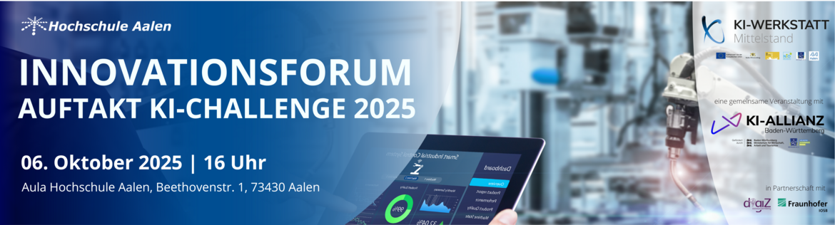 Die KI-Werkstatt Mittelstand der Hochschule Aalen und die KI-Allianz Baden-Württemberg laden Sie dazu gemeinsam zum Innovationsforum und dem damit verbundenen Auftakt zur KI-Challenge 2025 der KI-Allianz Baden-Württemberg im Ostalbkreis ein.