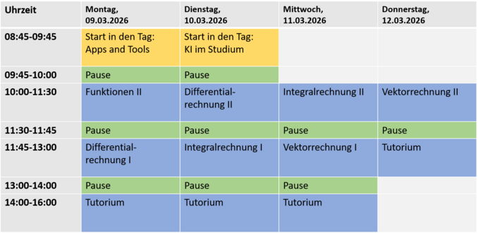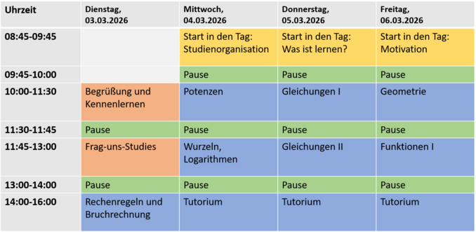 Jeweils am Vormittag sieht der Plan eine Einheit zu Lern- und Arbeitstechniken und eine doppelte Einheit zur Mathematik vor. Am Nachmittag können Sie die Mathematikinhalte in begleitenden Tutorien üben.