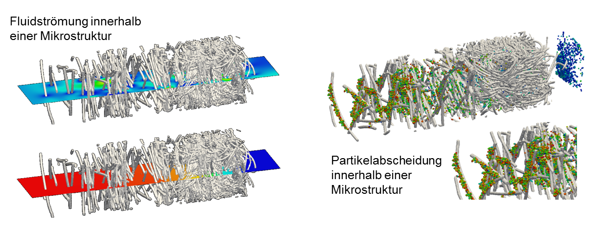 Die strömungsmechanischen Eigenschaften von Mikrostrukturen, wie etwa die Fitrationseffizienz von Filtermedien, werden maßgeblich durch ihren mikroskopischen Faseraufbau beeinflusst. Ausgehend von der geometrischen Erfassung solcher Mikrostrukturen, beispielsweise durch Computertomographie-Aufnahmen, können die Strömungsvorgänge innerhalb einer Mikrostrukturen mit modernen Lattice-Boltzmann Methoden berechnet werden. Mit speziell entwickelten numerischen Algorithmen lässt sich darüber hinaus der Transport von Partikeln und ihre Anlagerung an die mikroskopische Faserstruktur simulieren. Dabei werden alle relevanten Wechselwirkungen zwischen dem Fluid und den Partikeln, wie z.B. Widerstandskräfte und Brownsche Bewegung, berücksichtigt. Dies beinhaltet bei Anlagerungsprozessen insbesondere auch molekulare Kräfte, wie beispielsweise die van-der-Waals Kräfte. Die für die Durchströmung relevante Versperrung bereits abgeschiedener Partikel kann durch eine direkte Kopplung zwischen Partikel- und Fluidbewegung berücksichtigt werden.